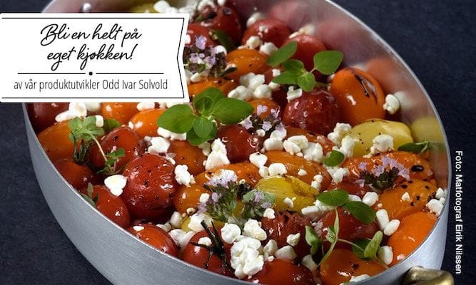 Velg gjerne små tomater, men gjerne litt ulike størrelser. Da får du noen som bakes litt mye og noen som er litt fastere, det gir en god struktur når du spiser.